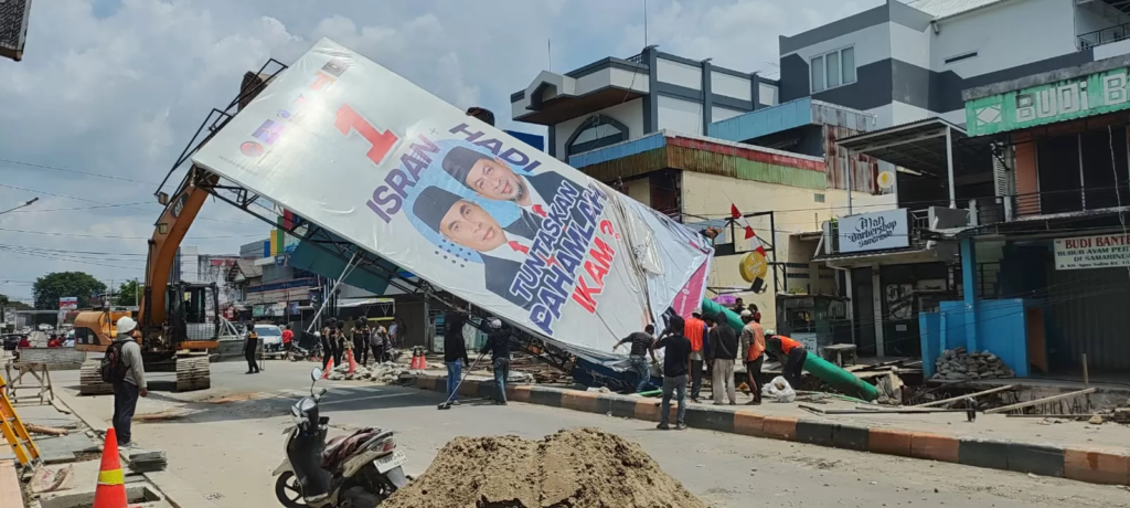 Baliho berbahan besi itu kemudian dipotong-potong oleh tim Tata Ruang dari Dinas Pekerjaan Umum dan Penataan Ruang (PUPR) Kota Samarinda yang datang ke lokasi. Langkah ini diambil agar jalan bisa segera difungsikan kembali.